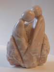 2009Twee figuren nader tot elkaar, voorzichtig uitgebeiteld, gevijld en geschuurd uit een speksteen van rose kleur.